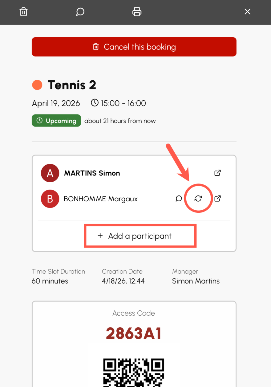 On the booking details, a dedicated button appears to the right of each listed participant: clicking on it allows you to choose the replacement. At the end of the list, a « Add a participant » button is available when the club's configuration still allows adding a name to the time slot (maximum number of participants).