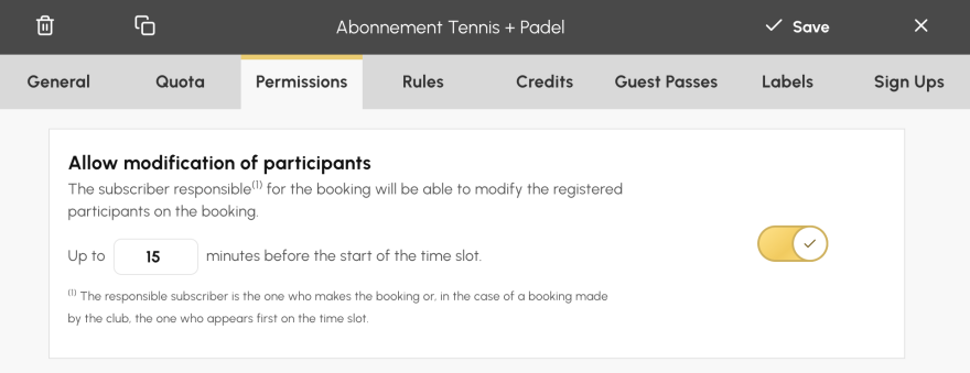 To access this setting, go to the menu « Administration > Users > Subscriptions », click on the subscription to configure, then open the tab « Permissions ». There you will find the new option « Allow modification of participants », along with the field to enter the desired delay.